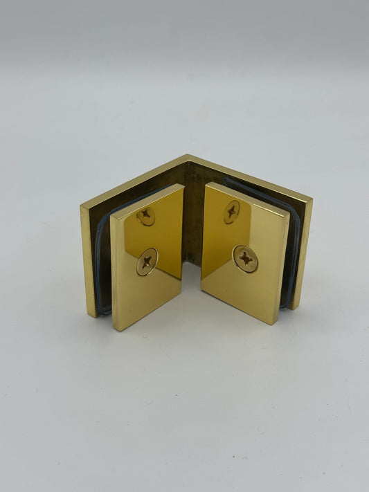 Square 90 Degree Glass to Glass Clamp - Hole in Glass - 10mm and 12mm Glass - POLISHED BRASS